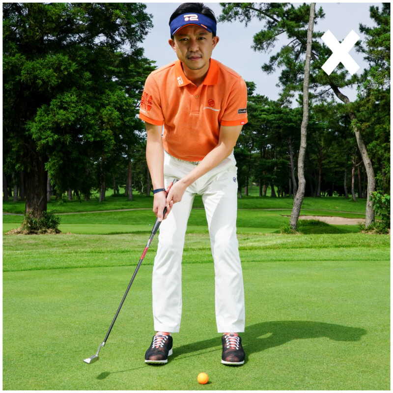 パッティングの打ち方にはタップ式とストローク式がありますが、2メートル前後の距離はタップ式のほうが距離感を合わせやすい。ストローク式はバックスイングの大きさとスピードの2つの要素で距離を調整するため、じつは難易度が高いのです。ストロークもヘッドを大きく動かすことになるので、体が流れやすくなってしまいます。