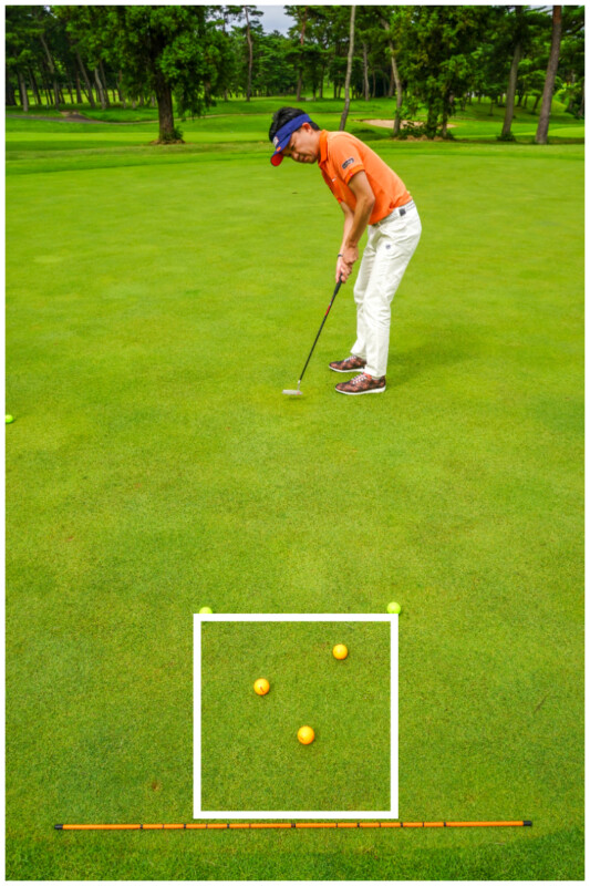 絶対に入れたいパット 練習法2メートルのマイゾーンを作る Step1 約2メートルのパットを40センチ四方の中に止める