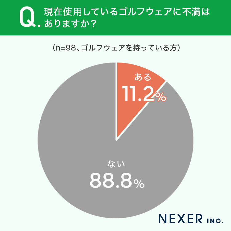 現在使用しているゴルフウェアに不満があるかどうかを尋ねたところ、「不満がある」と回答した人は11.2%にとどまり、およそ9割は概ね満足しているという結果でした。
