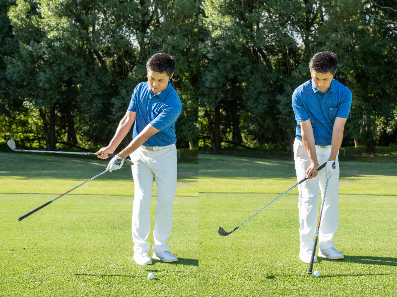 このとき足首から体を回すようにすると、体全体が回りやすくなります。手だけで打とうとしたり、胸と腰が別に動いてしまうとダフリやトップの原因になるので気をつけましょう。