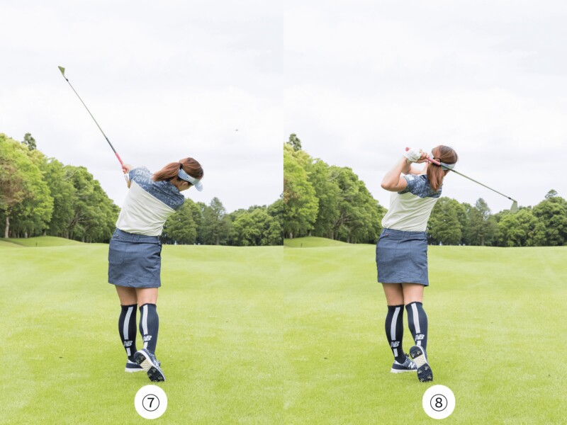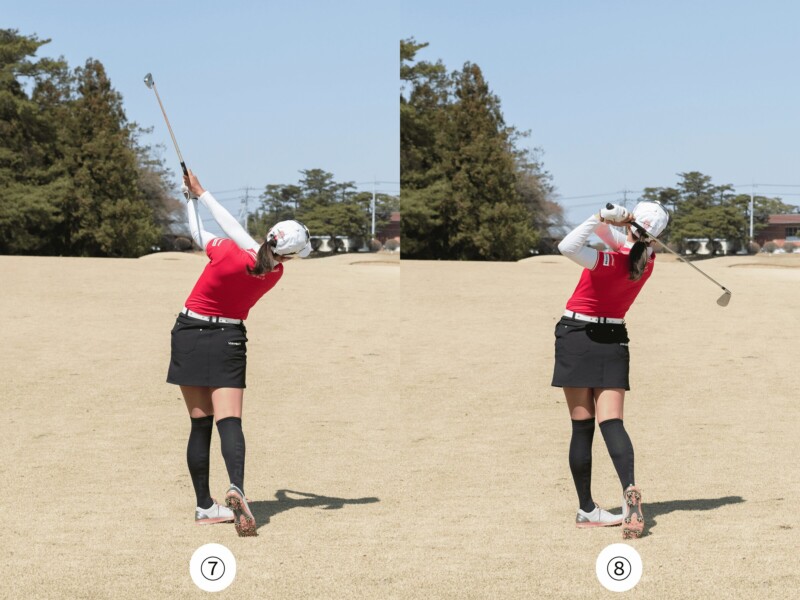 柔軟性の低い人は手元を動かして高く振り抜いてもOK(⑦)