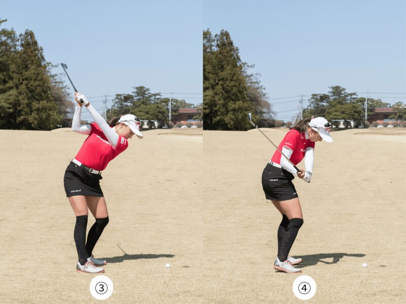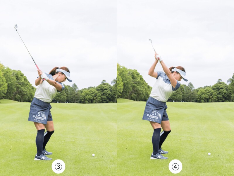 3人の中で、もっとも体のねじれが少ないのが有村選手で、❹のトップが参考になりますね。肩から骨盤までが大きくねじれすぎず、骨盤と肩、体の側面を結ぶラインが、きれいな長方形になっていますが、この長方形が歪まないようにクラブを振り上げるとトップの位置が安定します。左のワキ腹が縮まったり右のワキ腹が伸びたりすると、頭が目標方向に倒れやすくなって長方形が歪んでしまうので注意してください。
