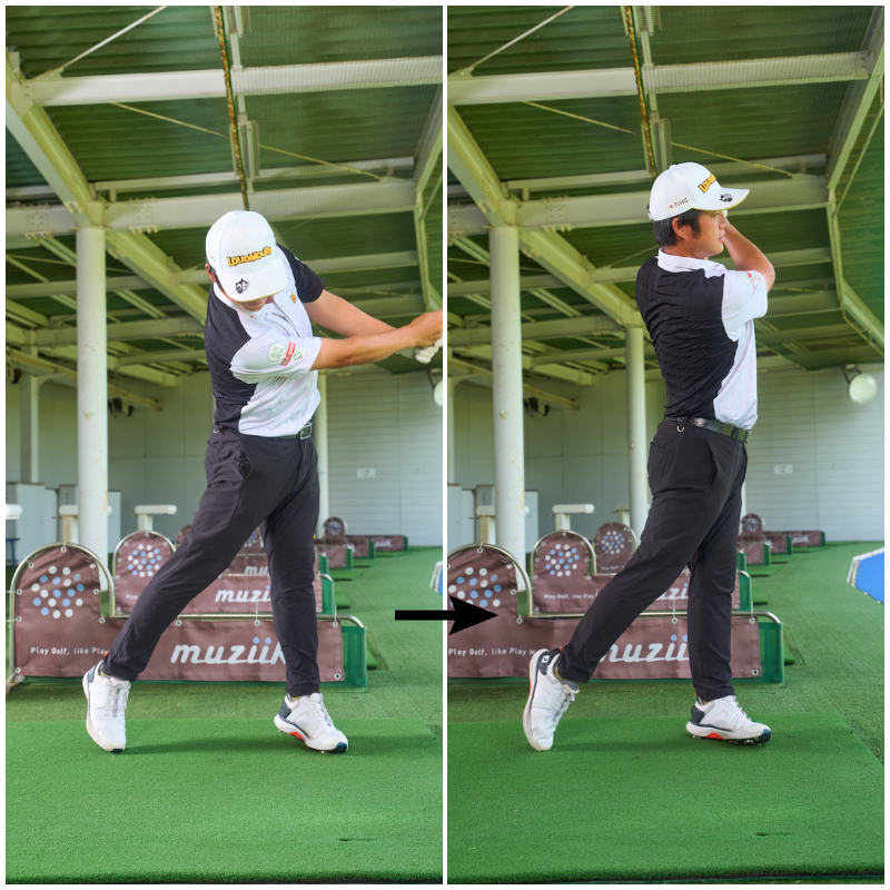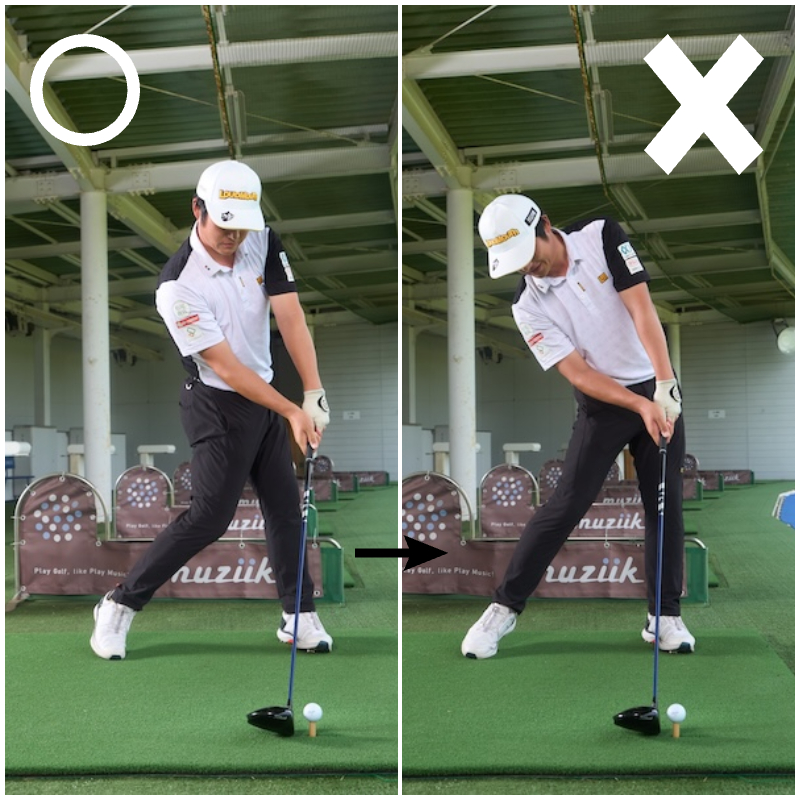 体を右に回すだけでは「ただの回転」になり、飛ばしのパワーが逃げてしまう。前傾姿勢も崩れやすいので注意。