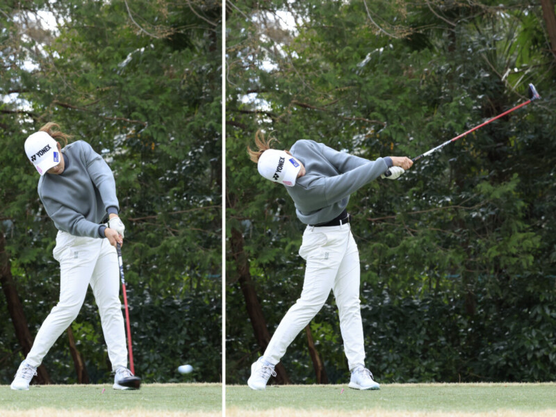 スイングにおいて際立つのは、ダウンスイングでの足の踏み替え。左右の足の力がバランスよく出ていないと、右サイドに体重が残ったり、骨盤がターゲット方向にスライドすることがあるが、彼女のスイングにはまったくそれがない。