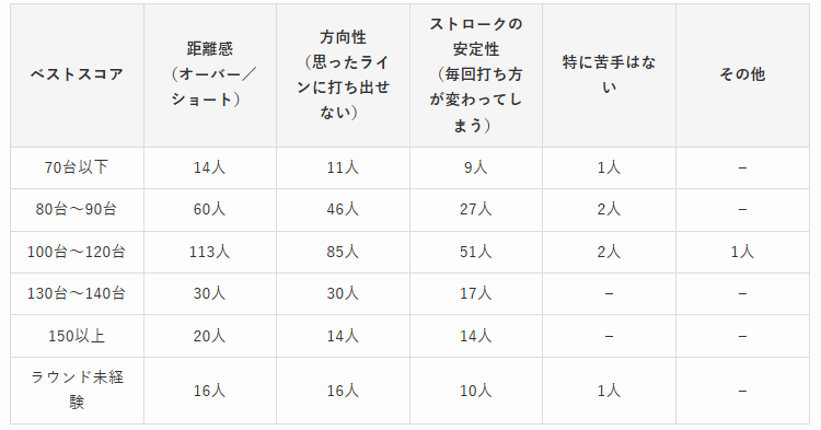スコア帯別に見ると、ラウンド未経験や150以上の層では、「距離感」と「方向性」の両方に課題が集中し、100〜120台の層では「距離感」が最多。80〜90台の層では「方向性」が多くる傾向が見られました。スコアが上がるにつれて、悩みの主軸が「距離感 → 方向性 → ストロークの安定性」と段階的に変化していくことが分かります。