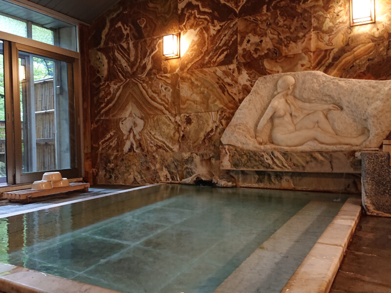 内湯だが露天風呂のような開放感のある「さるの湯」。湯あたりがやわらかくややぬるめ。泉質はナトリウム・カルシウム-硫酸塩・塩化物泉。pH値は7.7。源泉は向瀧1号、2号、3号混合泉で56.2度