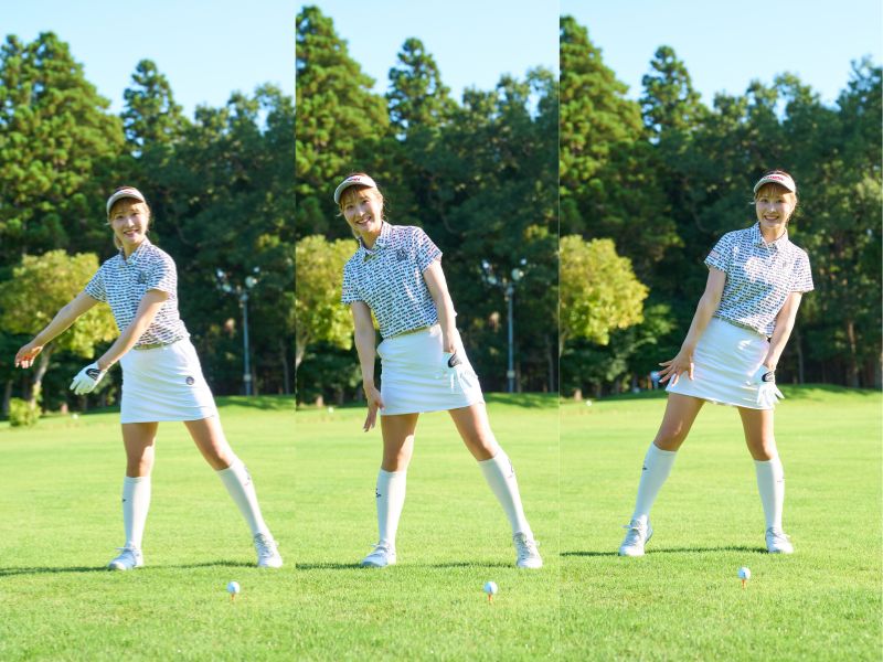 すぐさま左右に足踏みできて、体と腕を揺さぶれる力感で構える。「打つ前にこの“さゆさゆ”をしてからアドレス、スイングへと入っていくのもオススメですよ」(ミヤコレ)