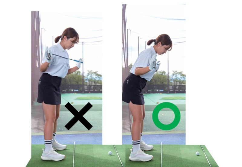 このときに、気をつけてほしいのが肩の向き。ボールと体の間には間隔があるので、目標を向いたラインは2本存在します。ところが、ボールから目標を向けたラインに体の向きを合わせてしまい、左を向いてしまう人がたくさんいる(×)。あなたもそうなっていませんか?