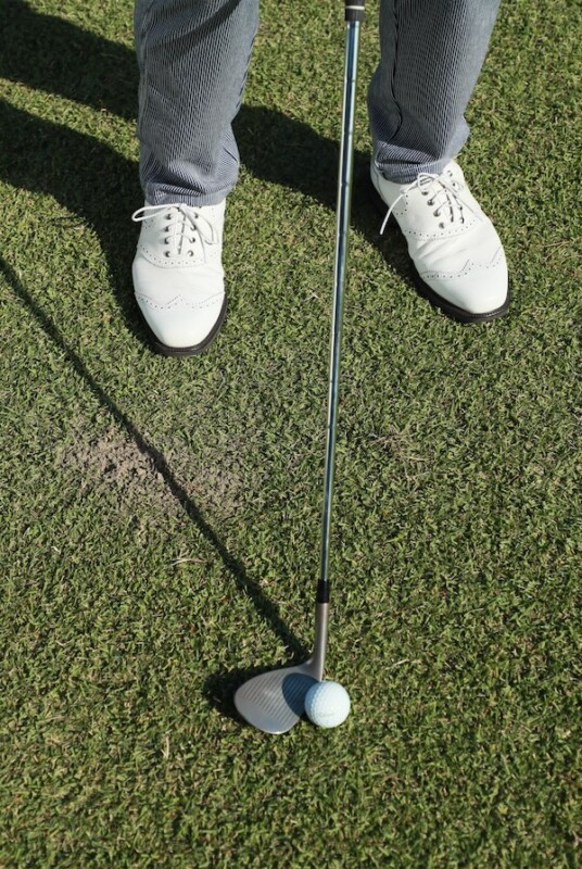 ボールは右足のツマ先前まで右に寄せて、フルショットのときよりも、ハンドファーストにして構える