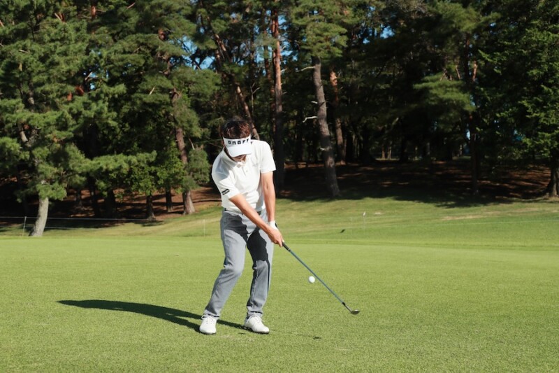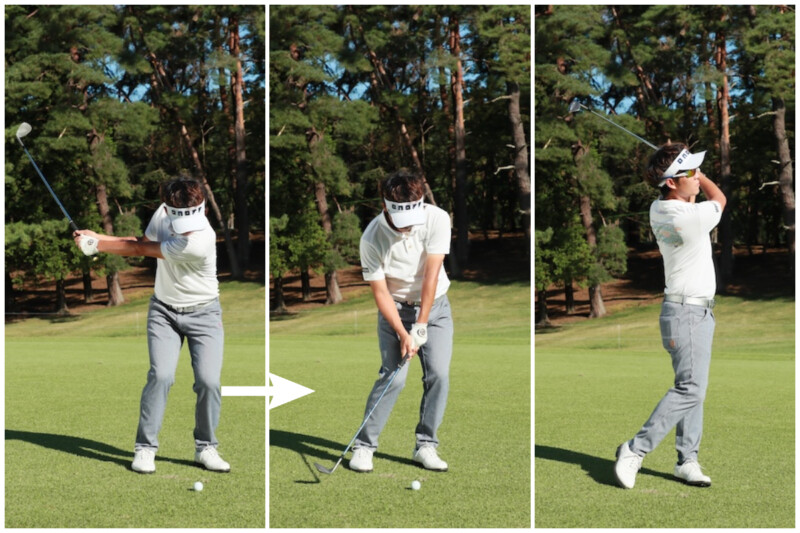 インパクトでヘッドを低い位置から入れて、低い位置に抜いていく。このテクは夏場の長くて深いラフでも使える。