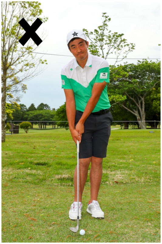高く上げるには、SWのフェースを開いてボールをやや左に置きますが、これだけでは不十分。ヒザを曲げて体の重心を下げ、ボールから少し離れて構えるのがコツです。重心位置が高いとボールは上がりにくく、体とボールの距離が近いとインパクトが詰まってしまいます。
