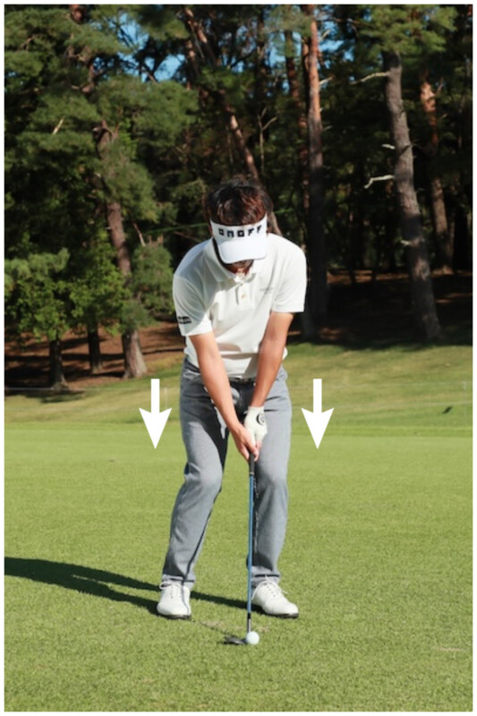 ヒザを曲げて、体の重心をいつもより下げることが大切。このヒザの高さが変わらないようにスイングしよう。