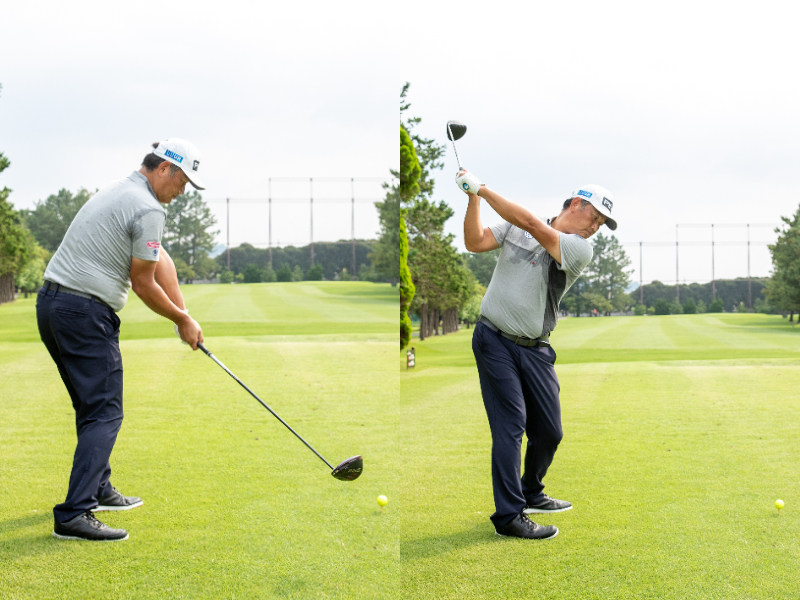 トップでヘッドをインからアウトへとループさせて、アウトサイドから下ろす感覚だが、腰がしっかり先行して回れば、極端なアウトサイド軌道にならない