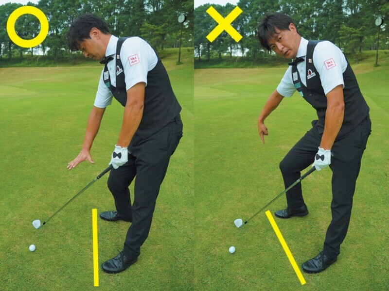 スライスを打つがスタンスはスクエアにする(○)。右側が高いライでオープンスタンスにすると右足が邪魔なり、クラブを振るスペースが窮屈になってしまう(×)。