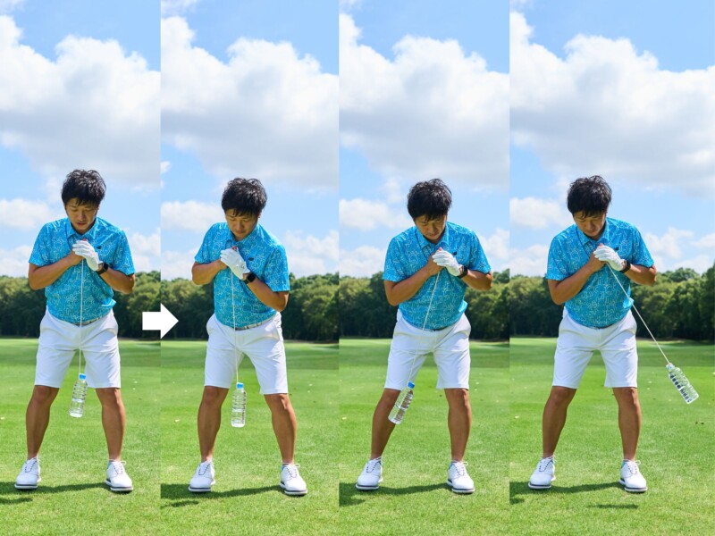 動きの動力は体の揺さぶりですが、ペットボトルを加速させるには、体とペットボトルが引っぱり合うような逆方向の動きが必要になります。この「体とクラブの引き合い」こそが1つめの振り子のカギです。