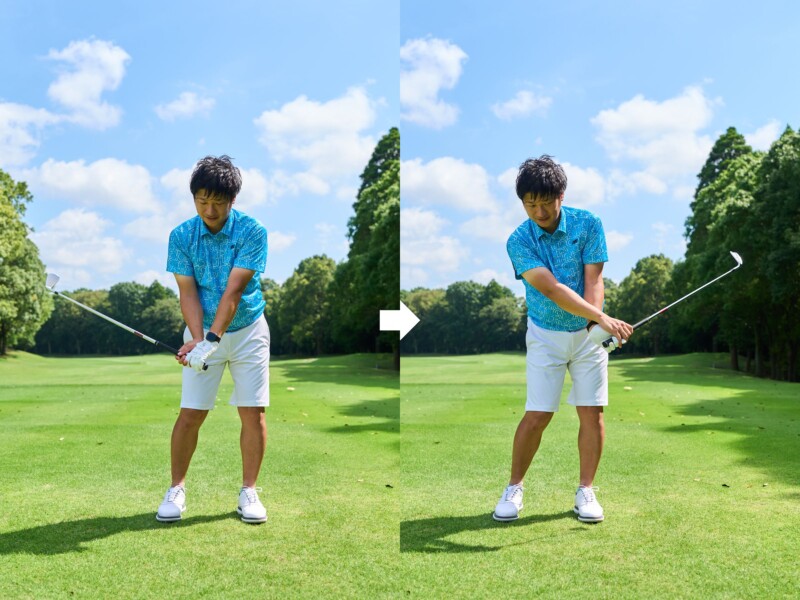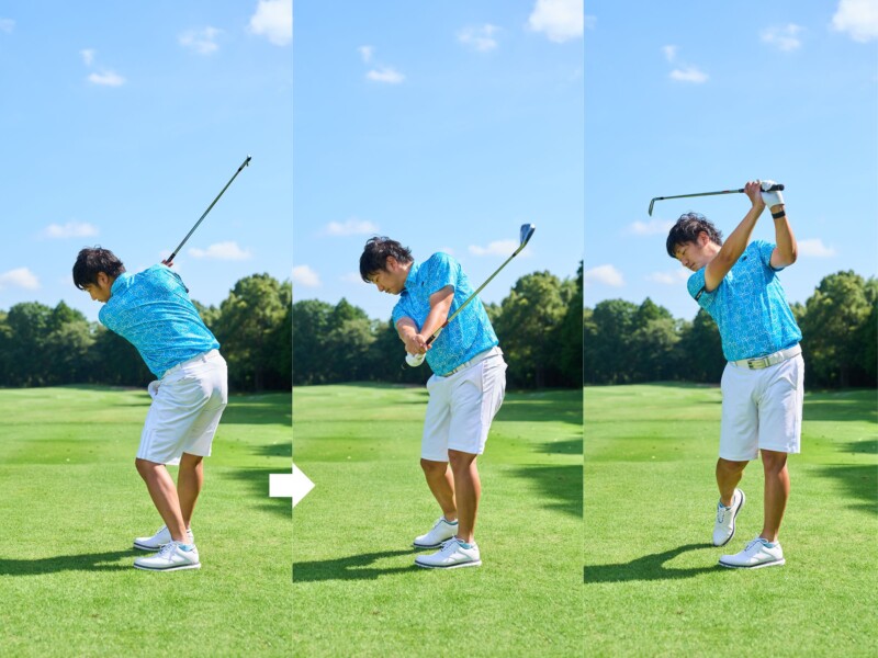 ヒジと手首の動きだけでクラブが背中に当たるくらい大きく振れればOK