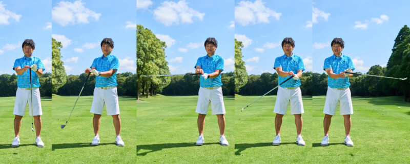 1つめは「体」での振り子。胸にくっつけたクラブを体の動きだけで振り子のように揺らし、加速させられる動き。