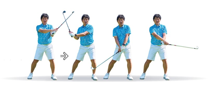 手首をやわらかく使って体の前でクラブをグルグルと回す。この「周期」を乱さずにクラブを加速できるような体の使い方がポイントになる。