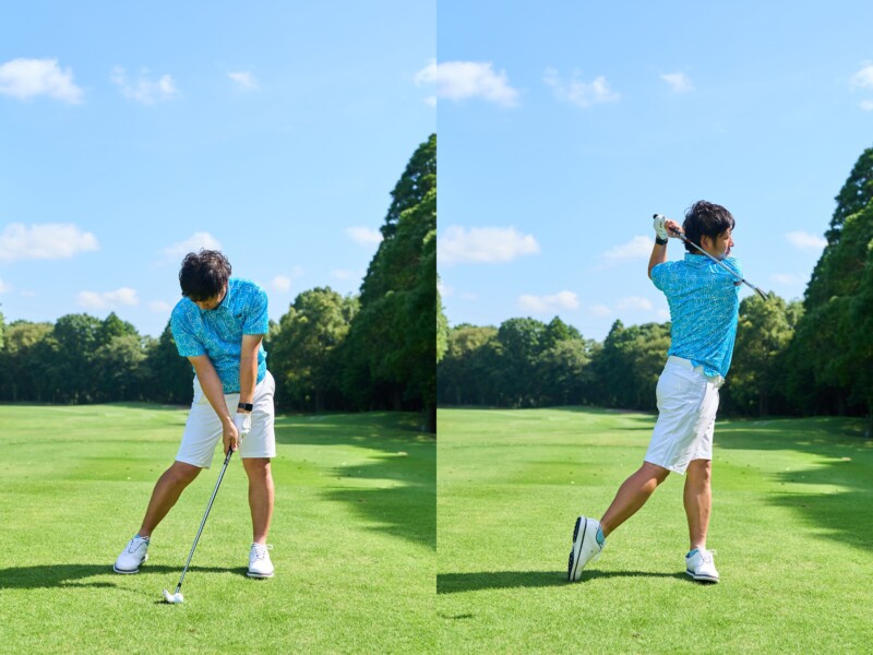 ポイントはクラブと体の「引き合い」。バックスイングでは体を左に、そのまま踏み込んでフォローでは体を右に揺さぶるようにバランスをとれれば、いいリズムが身につきます。