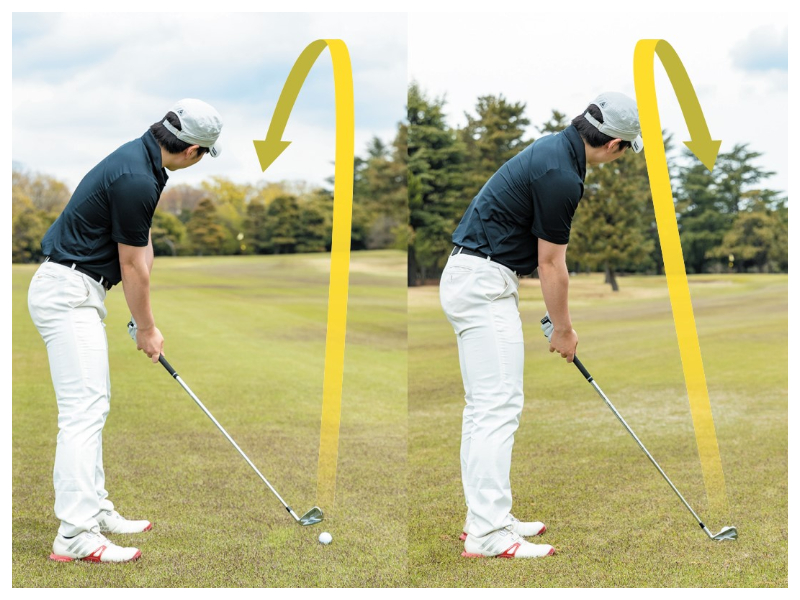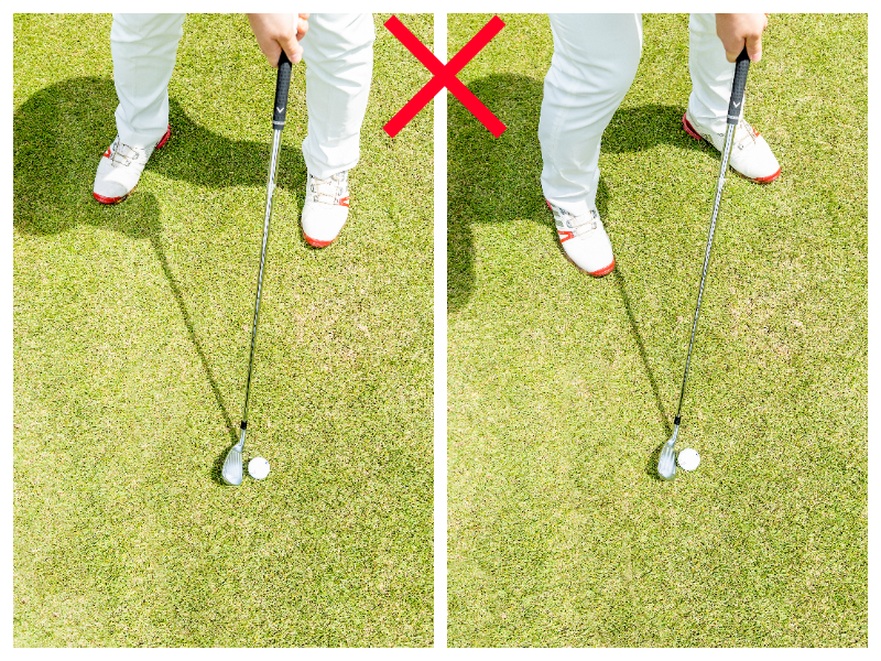 スクエアな構えからその場で体を左に向けると、ボール位置が右に寄りすぎてしまう(右)