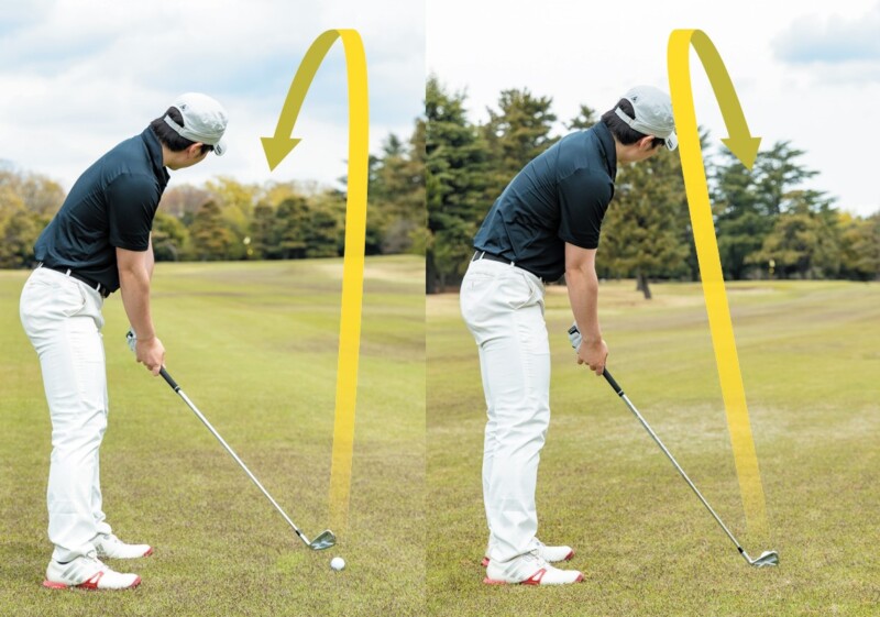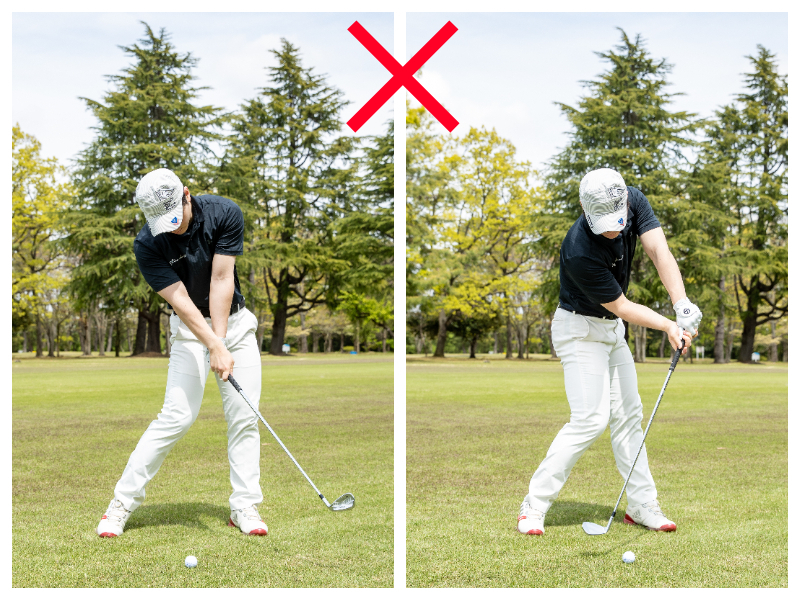 フックを打つときも、その場で体の向きだけ右に向けるとボール位置が左すぎてしまう(左)