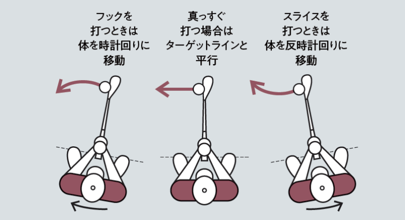 フェースターンを使ってフックを打つと、チーピンなど左へのミスになりやすい(左)
