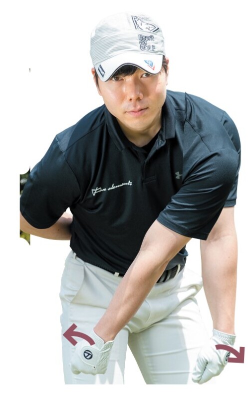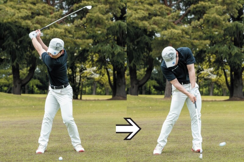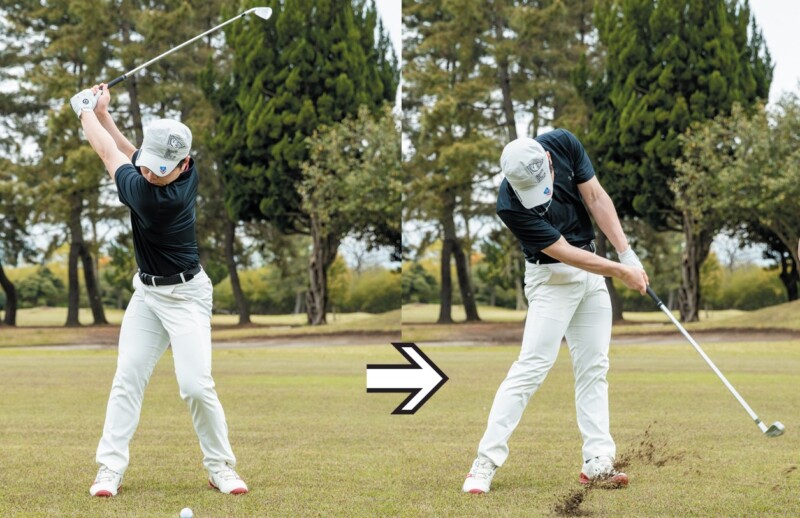 クローズスタンスに構えることで自然なリストワークが起こる。スライスと比較するとインパクトはハンドファーストにとらえるイメージが強い