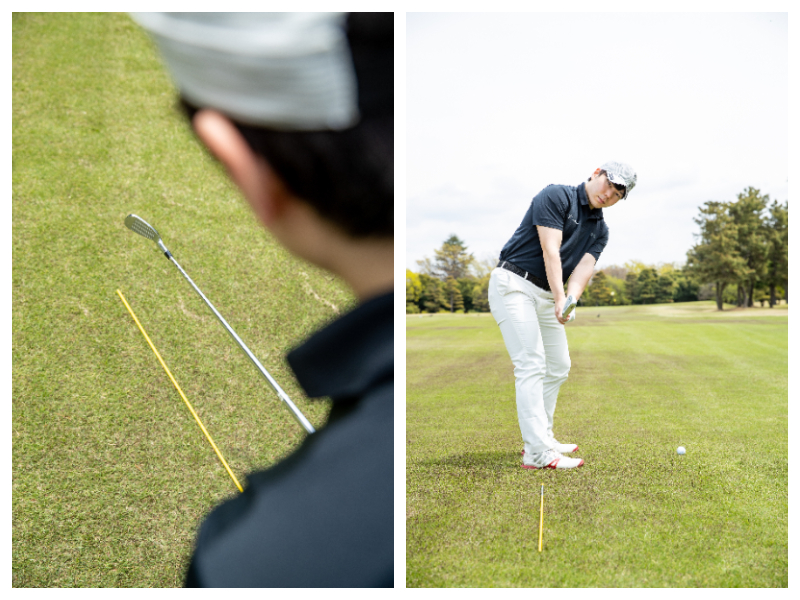 あらかじめアウトサイド・インの軌道に沿って、地面にスティックを置く。このスティックと平行に見える角度から振り下ろす
