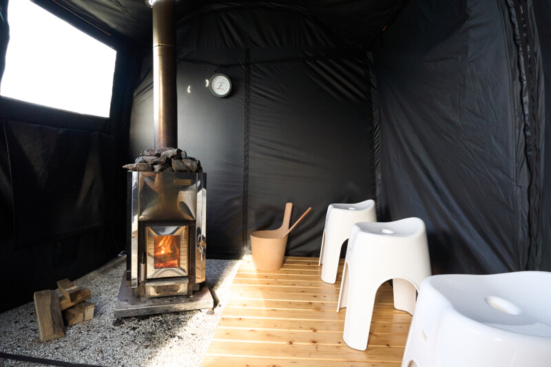 また、プールサイドに設置された11月から3月の季節限定のテントサウナは、人気アクティビティの一つ。薪ストーブの柔らかい熱は、体の芯からじわじわ温めてくれる。また、テントサウナのアロマを選ぶことができて、シークヮーサー、ハーブなど沖縄らしい香りに癒される。