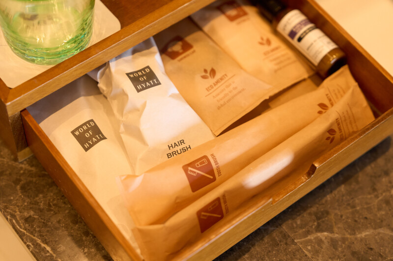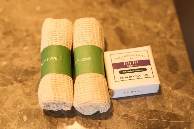 歯ブラシやブラシ類はエコ素材で統一され、使い勝手と環境配慮のバランスも優秀。細部まで整えられた“プレー後の快適さ”が、このホテルのレベルの高さを物語っている。