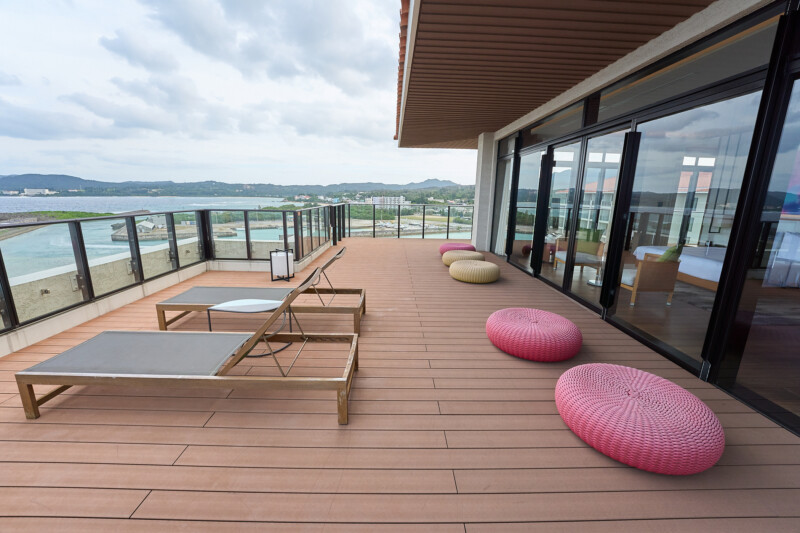 窓を開ければ、三方向から入り込む海風と波の音。オープンエアのバルコニーには広いデイベッドが置かれ、夕暮れ時には空の色がゆっくりと変わっていくのを眺めながら、ただ静かに過ごすだけで心がほどけていく。プレー後の体をバスタブで伸ばし、外の景色を眺めるだけでも日頃の疲労が自然と抜けていくだろう。