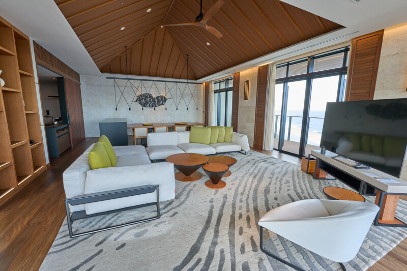 本島側の静かなビーチフロントに広がる「ザ・ビーチハウス」は、“暮らすように滞在する”というコンセプトをもとにデザインされた一室。約55㎡のゆったりとした空間にはリビングと簡易キッチンが備わっていて、短い滞在だけでなく、家族でロングステイする人も多いらしい。