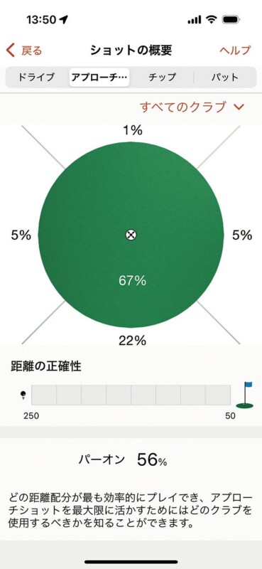 アプローチと表記された50ヤード以上のグリーンを狙うショット。チップと表記された50ヤード以内のショット。そしてパットだ。おもにチェックしたいのがティーショットとグリーンを狙うショットの2つ。細かなショット分析によってミスの傾向が確認できる。