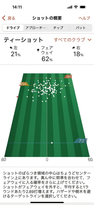 飛距離と着弾点を表示し、FWキープ率、左右どちらに曲げる確率が高いかがわかり、フェアウェイを外したときに平均でどのくらいスコアに影響するかを打数で表記してくれる。また、ドライバーを複数登録すれば、飛距離や方向性の比較も可能だ
