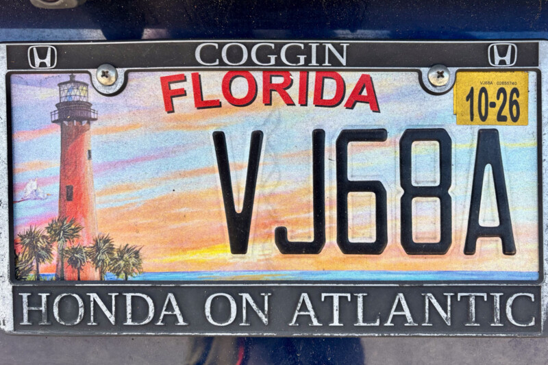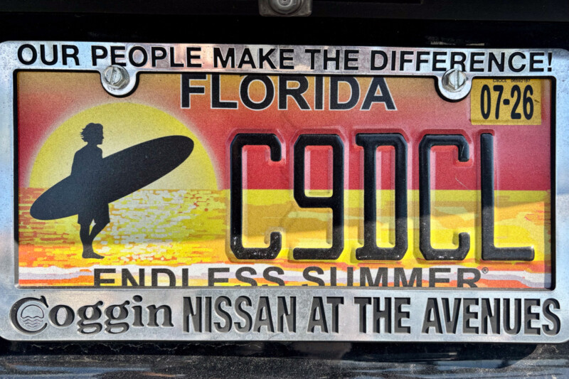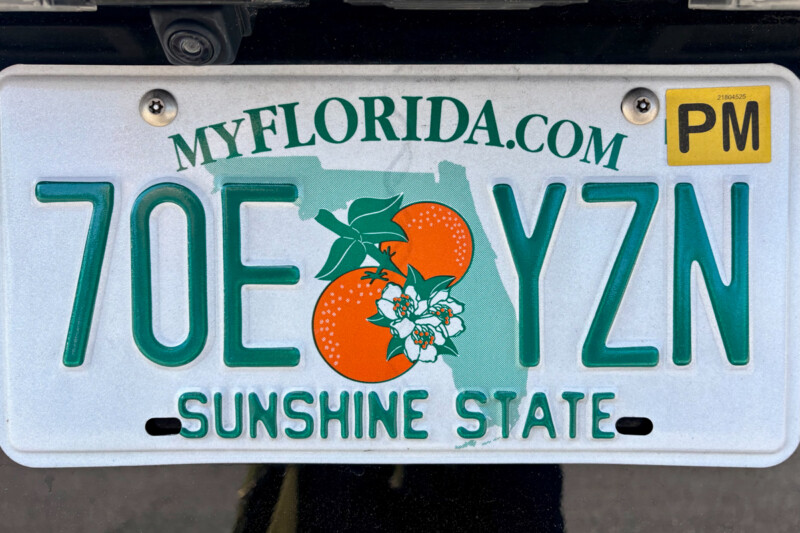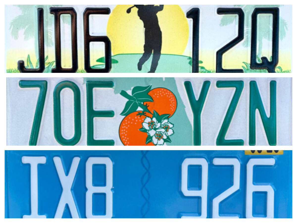 ノーマルなナンバープレートは、バックグラウンドにフロリダ州(フロリダ半島)のシルエットと名産のオレンジが描かれている。一方で、スペシャリティーナンバーのデザインは無数にある。