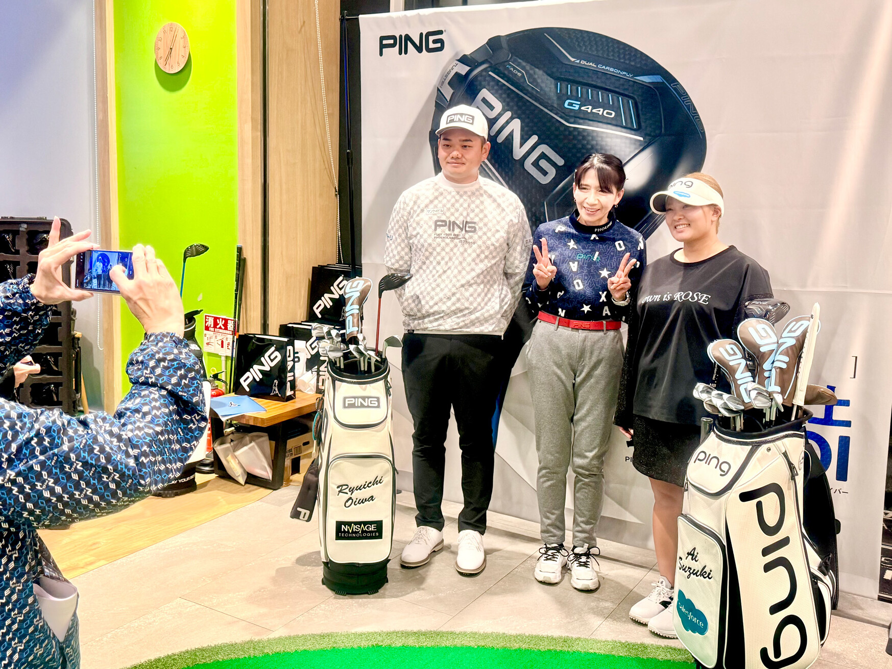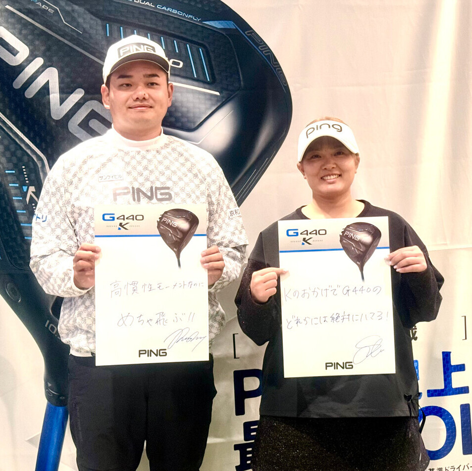 抽選で選ばれ“最速試打”に参加した約20名の「CLUB PING」会員は、ふだんからピンのドライバーでプレーする人たちだが、「G440 K」を打つと今まで以上の試打結果が出ることに、買い替えをせずにはいられない雰囲気だった。また、試打の合間には両プロとの3ショット撮影会も行なわれた