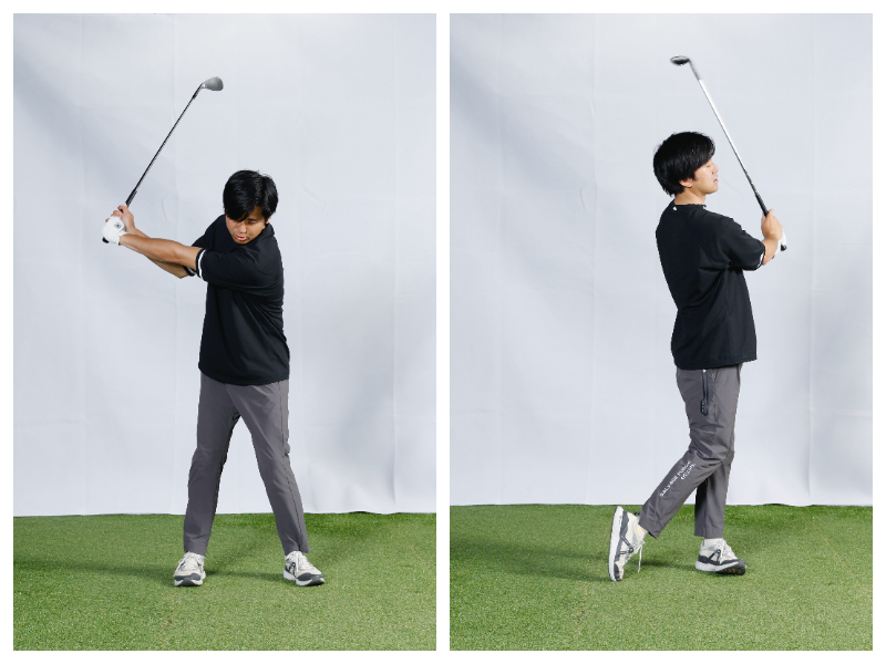 朝の練習では、いかにバランスよく振るかが大切。狙ったところにボールを打てない人は、スイングリズムが悪くて振り切れていないケースが多い(×)。長いクラブはゆっくりと、短いクラブは少し速めのリズムで振りながらカッコいいフィニッシュをとるのが基本(〇)。普段の練習から、最初の30球はスタート前の練習と考え、スイングリズムを気にしながらボールを打っておくと、本番スタート前の練習もより効果的に行なえる