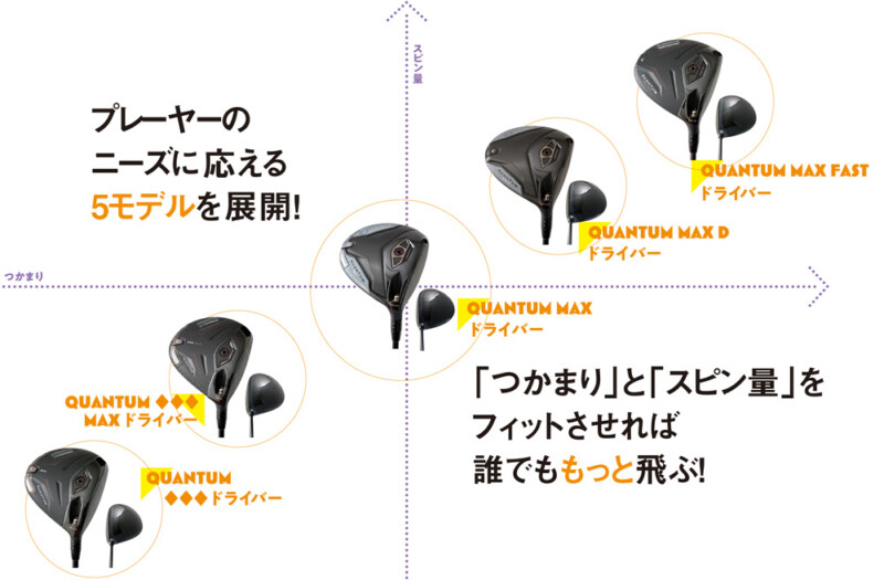 ターゲットとするユーザー層を明確化し、それぞれの悩みを解消する5モデルを展開。「MAX」と「MAX D」にはクラウンにカーボン、ソールにチタンを採用することで低重心化を図り、より高弾道のボールが打ちやすい設計。対して◆◆◆の2機種とMAX FASTの計3機種にはクラウンからソールまでカーボンを使用した「360°カーボンシャーシ」で余剰重量を創出。適正位置に再配分することで、操作性を向上させている。