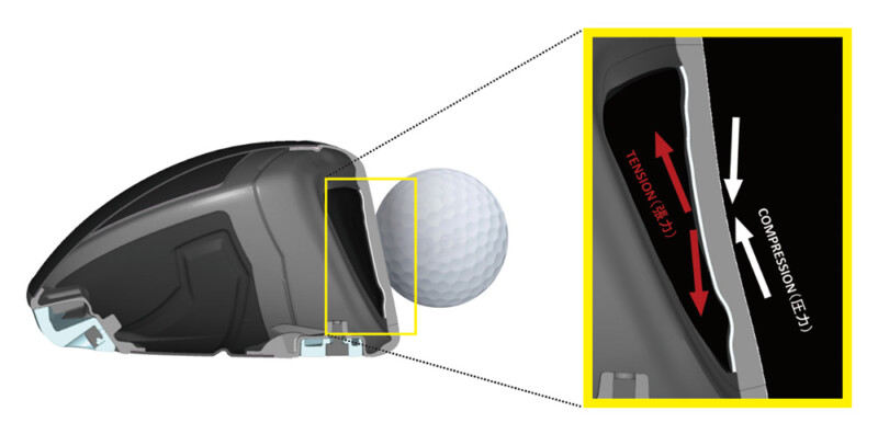 図からわかるように、インパクト時はフェースの表面(ボールコンタクト側)に「圧力」という素材が“縮む”力がかかり、裏面には「張力」という素材が“伸びる”力がかかる。