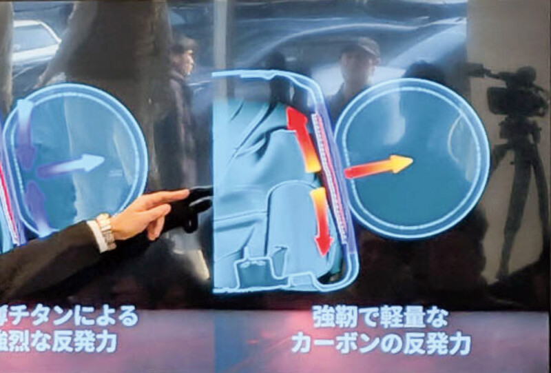 キャロウェイゴルフ取締役副社長で、プロダクト担当の倉島隆夫氏が、最新モデル【QUANTUM】ドライバーの“三層フェース”について解説。一番外側がチタン、真ん中がポリメッシュ、内側がカーボンの異素材による三層構造で、へこみ(圧力)に強い「極薄チタン」と、伸びる方向(張力)に強い「カーボン」の双方のいいとこどりのフェースになっている。耐久性にすぐれ、フェースはたわむのに初速が出る、ユニークかつ画期的なフェーステクノロジー(=TRI-FORCE構造)だ。