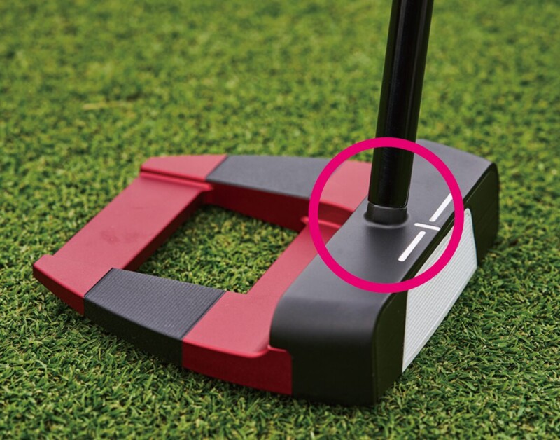 フェース付近(○部分)にシャフトを挿すことによって体に対して〝真っすぐに〞構えられる。違和感のないアドレスはスムーズなストロークにつながる
