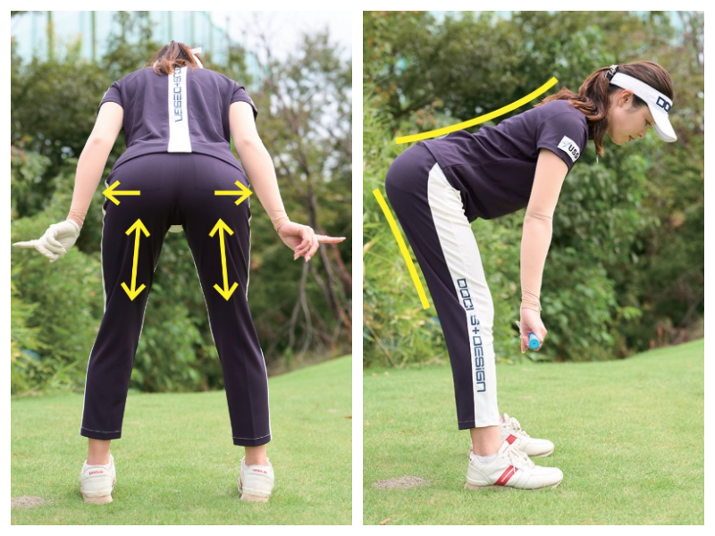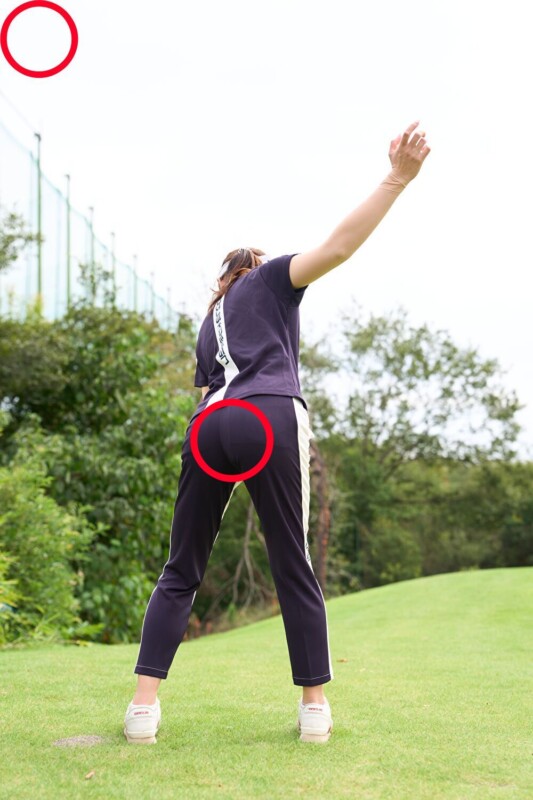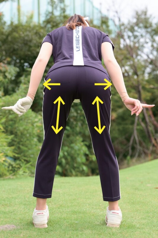 モモ裏は上下に、お尻は外に向かってストレッチしている感覚が○。この感覚をスイング中もキープすることが重要