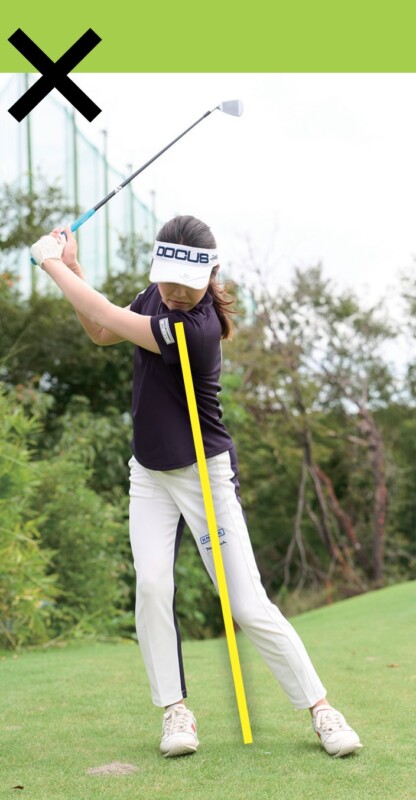 スエーを防ぐ意識は大切だが、お尻の右側をうまく使えずに右足だけで突っ張ってしまうと、体重移動やスムーズな回転運動が行なえないので×