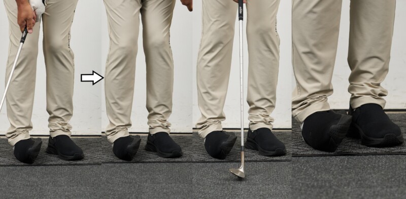 今井克宗プロに教わったというイップス対策。右足裏を左に向けて構えることで、スイング中に右ヒザが前や横に出なくなる。すると、ソールから地面に当たりやすくなるのでクラブが刺さりにくい