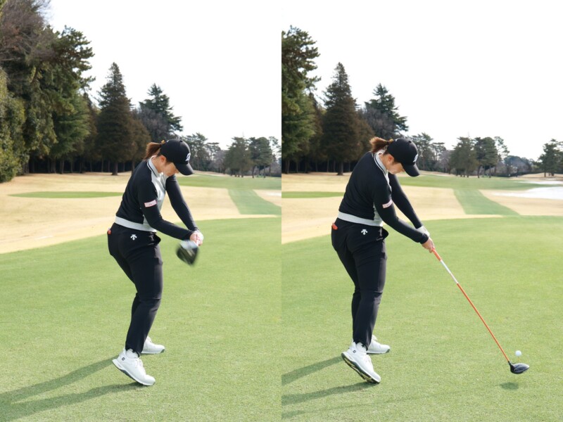 フェース面の「スクエアキープ」が渡邉選手の武器。ダウンスイングでは体の回転によって腕とクラブに慣性がはたらき、フェースが開きやすい。そこを見事にスクエアにキープしているので、飛距離と方向性をどちらも向上させている。