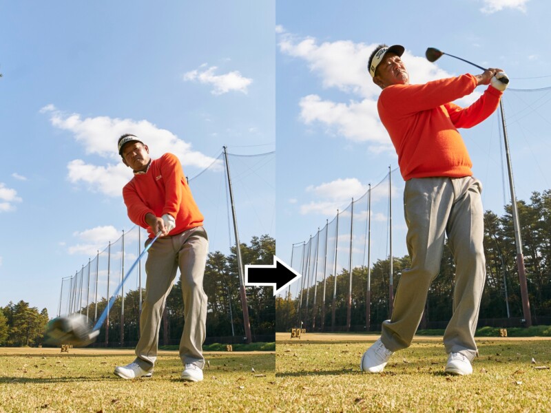 右から左への体重移動を積極的に行ない腕をやわらかく使うと歳をとっても飛ばせる