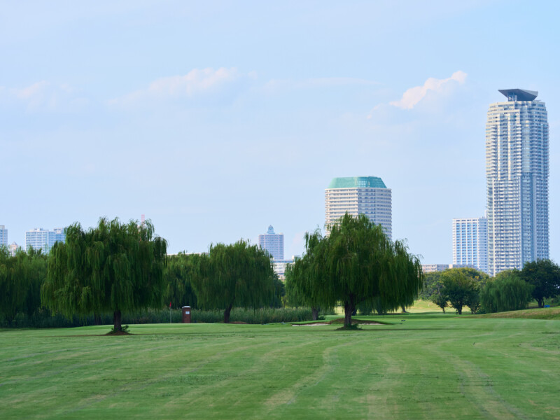 遠くに高層ビルを見ながら、ビギナーからベテランまで楽しめる「都会の上達の虎の穴」です